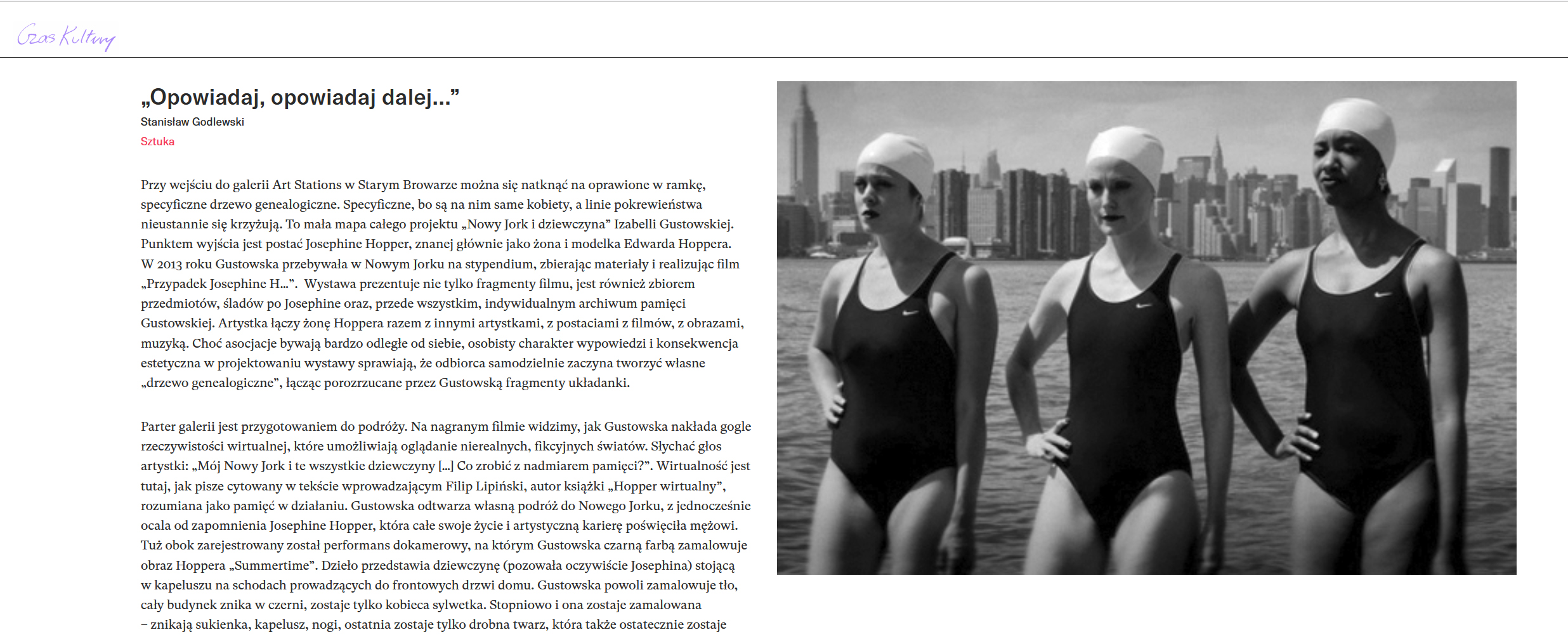 "Przy wejściu do galerii Art Stations w Starym Browarze można się natknąć na oprawione w ramkę, specyficzne drzewo genealogiczne. Specyficzne, bo są na nim same kobiety, a linie pokrewieństwa nieustannie się krzyżują. To mała mapa całego projektu „Nowy Jork i dziewczyna” Izabelli Gustowskiej. Punktem wyjścia jest postać Josephine Hopper, znanej głównie jako żona i modelka Edwarda Hoppera. W 2013 roku Gustowska przebywała w Nowym Jorku na stypendium, zbierając materiały i realizując film „Przypadek Josephine H…”. Wystawa prezentuje nie tylko fragmenty filmu, jest również zbiorem przedmiotów, śladów po Josephine oraz, przede wszystkim, indywidualnym archiwum pamięci Gustowskiej. Artystka łączy żonę Hoppera razem z innymi artystkami, z postaciami z filmów, z obrazami, muzyką. Choć asocjacje bywają bardzo odległe od siebie, osobisty charakter wypowiedzi i konsekwencja estetyczna w projektowaniu wystawy sprawiają, że odbiorca samodzielnie zaczyna tworzyć własne „drzewo genealogiczne”, łącząc porozrzucane przez Gustowską fragmenty układanki."