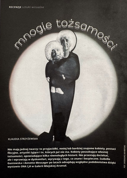 Dwie artystki, których twórczość bardzo intensywnie odcisnęła swój ślad w sztuce, nigdy się osobiście nie spotkały. Dzieli je pięć lat, Annette urodziła się w roku 1943, Izabella w 1948. Należą do tego samego pokolenia artystycznego, prawdopodobnie czytały te same książki, inspirowały je te same filmy, przeżywały te same wydarzenia – choć z perspektywy dwóch stron żelaznej kurtyny. Obydwie w swoich pracach łączyły, na własne odmienne sposoby, elementy fotografii, instalacji, rzeźby i tekstu. Ich twórczość jest głęboko zakorzeniona w tematach związanych z tożsamością, ciałem i pamięcią. Obie podejmują temat kobiecości – zarówno jako konstruktu społecznego, jak i osobistego doświadczenia. Obie kwestionowały stereotypowe role narzucone kobietom oraz ograniczenia wynikające z patriarchalnych struktur. Obie artystki w swojej twórczości podważały ideę jednolitej, spójnej tożsamości, ich prace często pokazywały, że „ja” to to tylko złożona, ale jednak zmienna konstrukcja kulturowa. Słowo pisane odgrywało ważną rolę w twórczości Messager, pojawiało się w instalacjach, haftach i kolażach. Tekst jako zapis poetycki i krytyczny – jako komentarz, manifest lub osobisty zapis towarzyszy także twórczości Izabelli Gustowskiej.